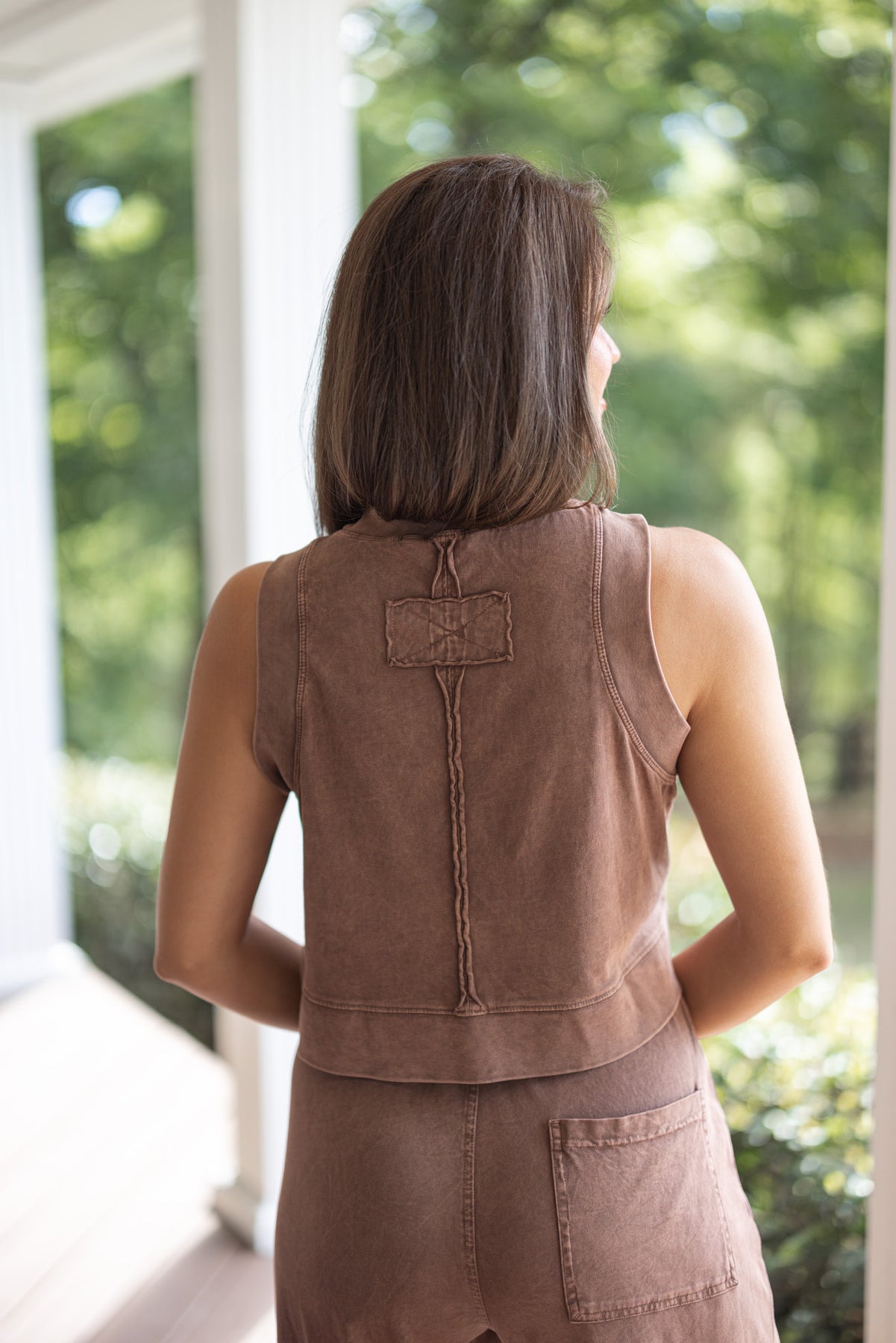 Elevate your style with the perfect blend of comfort and sophistication with our chic sleeveless cropped top. Crafted from breathable fabric, this trendy top is not only stylish but also incredibly comfy. The mineral wash adds a unique touch, giving it a distinct and fashionable look. Pair it effortlessly with the matching pants for a complete ensemble that's perfect for the spa, lounging at home, casual outings, picnics, or wherever your day takes you!