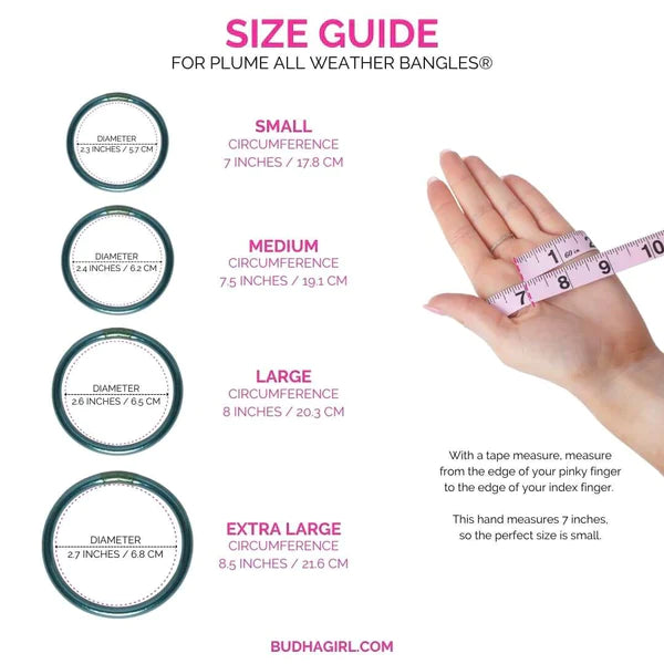 BuDhaGirl All Weather Bangles are made of polyvinyl carbonate tubing that is a semi-flexible material, so there is a little give when you slide the bangles over your hand. This really is the key to deciding your size... how the bangles go over your hand, not the size of your wrist.