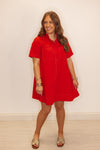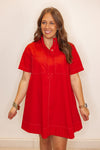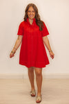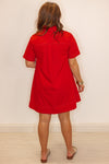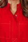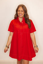 Find your happiness in the Chasing Joy Red Swing Dress! With red fabric, mock neck, and a button front bodice, this dress combines style and comfort. Featuring two front chest pockets and reverse stitching for a unique sassy touch. Get ready to swing into joy!