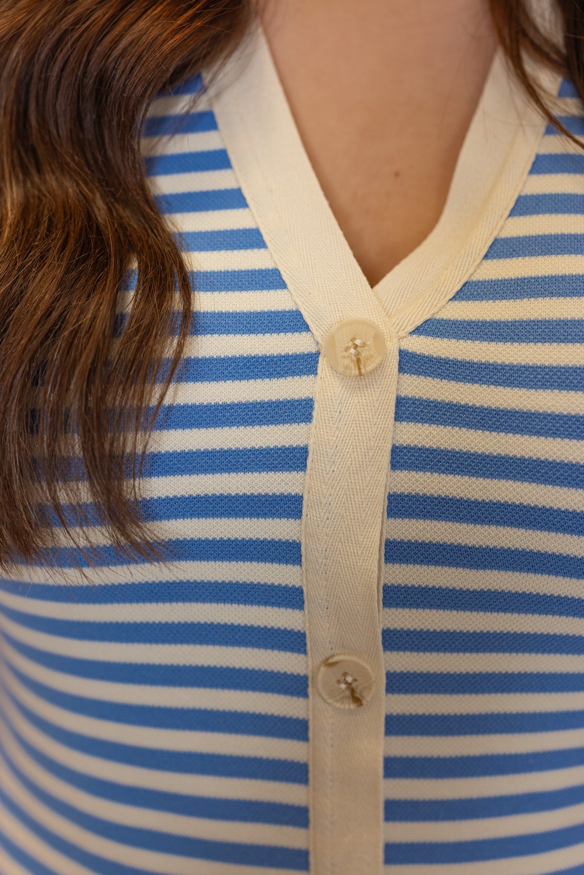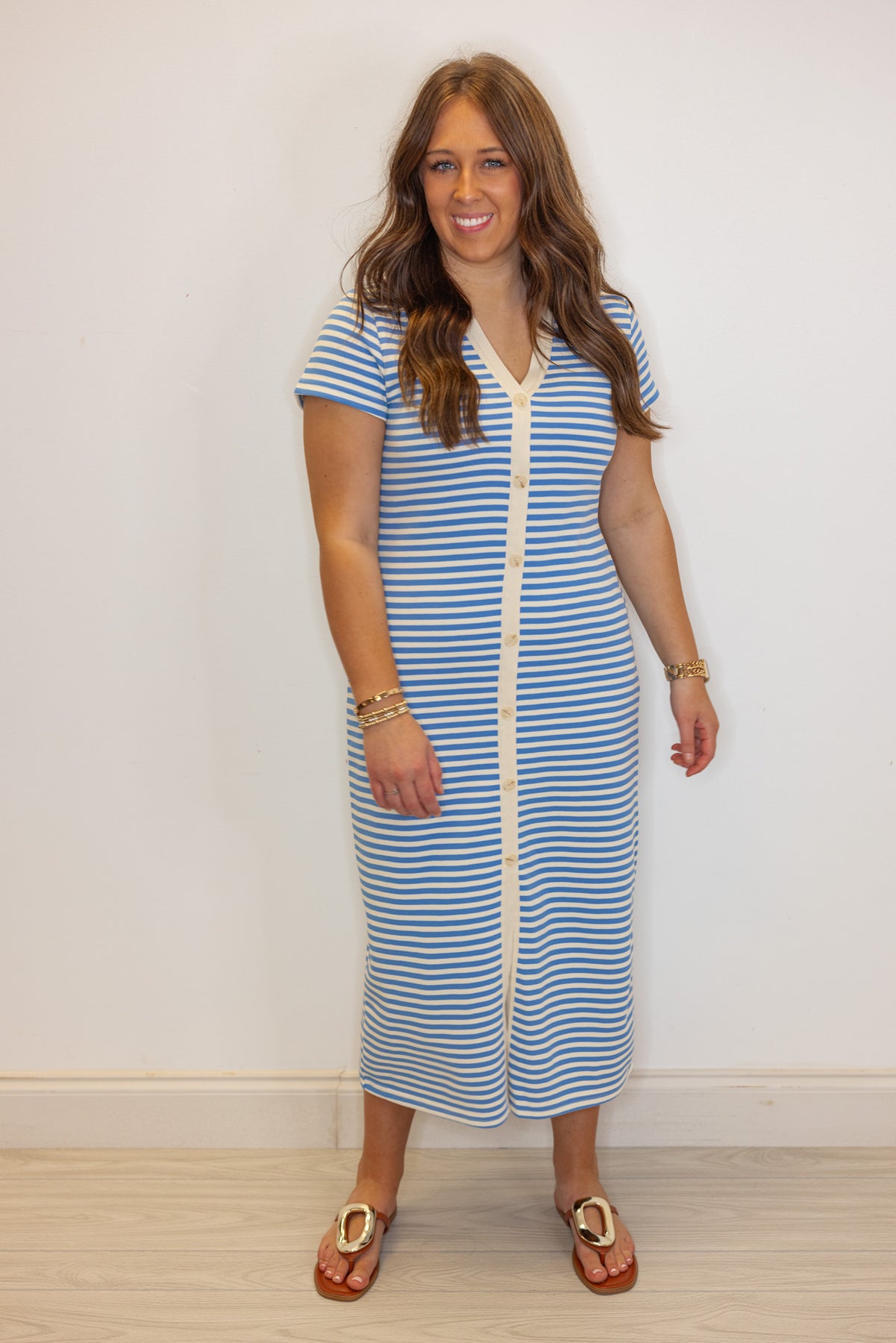 This midi dress is perfect for a stroll down the coast! Made of a soft blue and cream striped knit fabric, it features a flattering v neckline and button accents down the front. Add a touch of nautical glam to your wardrobe with this lovely striped babe!