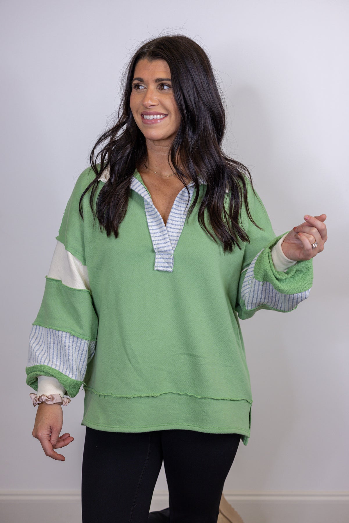 Cozy up in style with this Colorblock Fave Sage Green Pullover! The sage green and cream colorblock is french terry knit and features a v cut neckline with collar, and cuffed long balloon sleeves. Reverse seam details add a touch of unexpected charm - making this pullover perfect for all your casual trending needs!