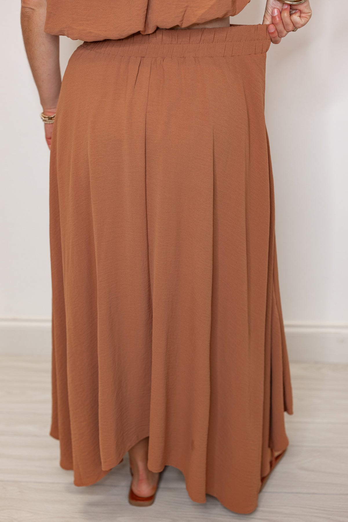Get ready for Dreamy Summer Nights with this sassy caramel textured midi skirt! Featuring an elastic waistband in back, with a smooth front for an elegant look. The flowy, pleated style and asymmetrical bottom hem add a flirty twist to this dreamy skirt. Pair with our matching top for the perfect outfit!