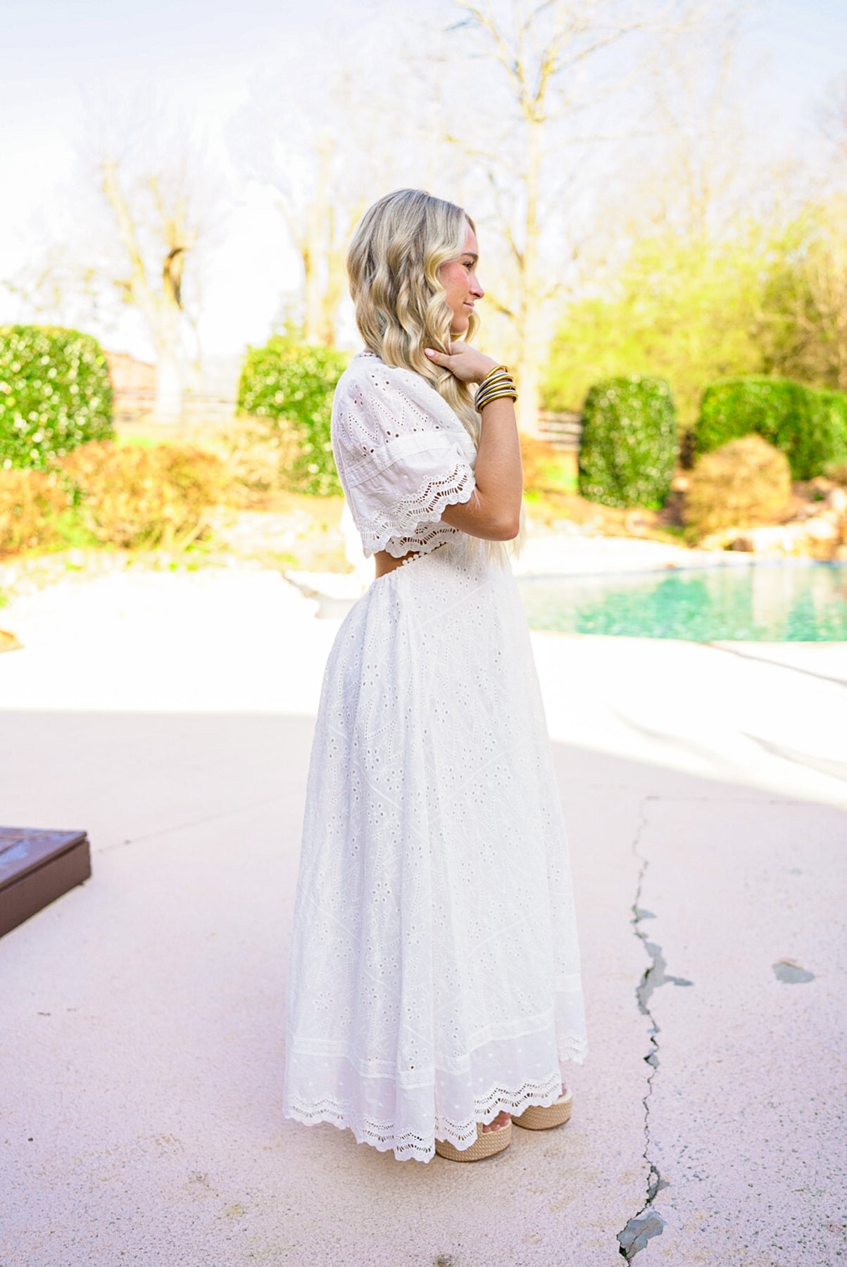 Indulge in ultimate elegance with our Eyelet Lace Maxi Dress. Designed with flutter sleeves, o-ring detailing, and intricate eyelet embroidery, this dress is the perfect balance of sophistication and femininity. The side cutouts and open back add a touch of allure. This gorgeous dress is perfect for brides or for any special occasion.