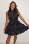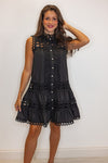 Get ready to sweep them off their feet with our First Romance Black Lace Dress. This mini dress features an accented pearl button closure and delicate lace trim for a touch of elegance. Sleeveless, it's perfect for any occasion.