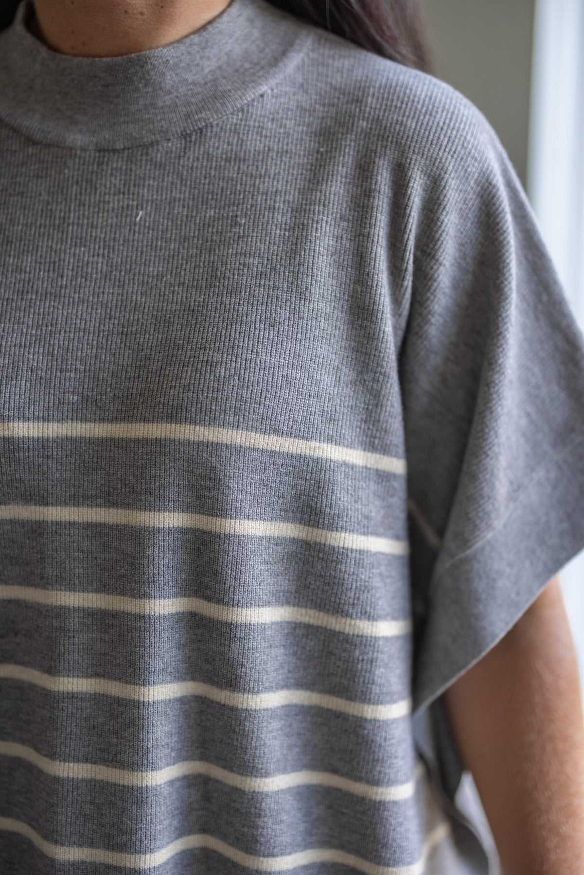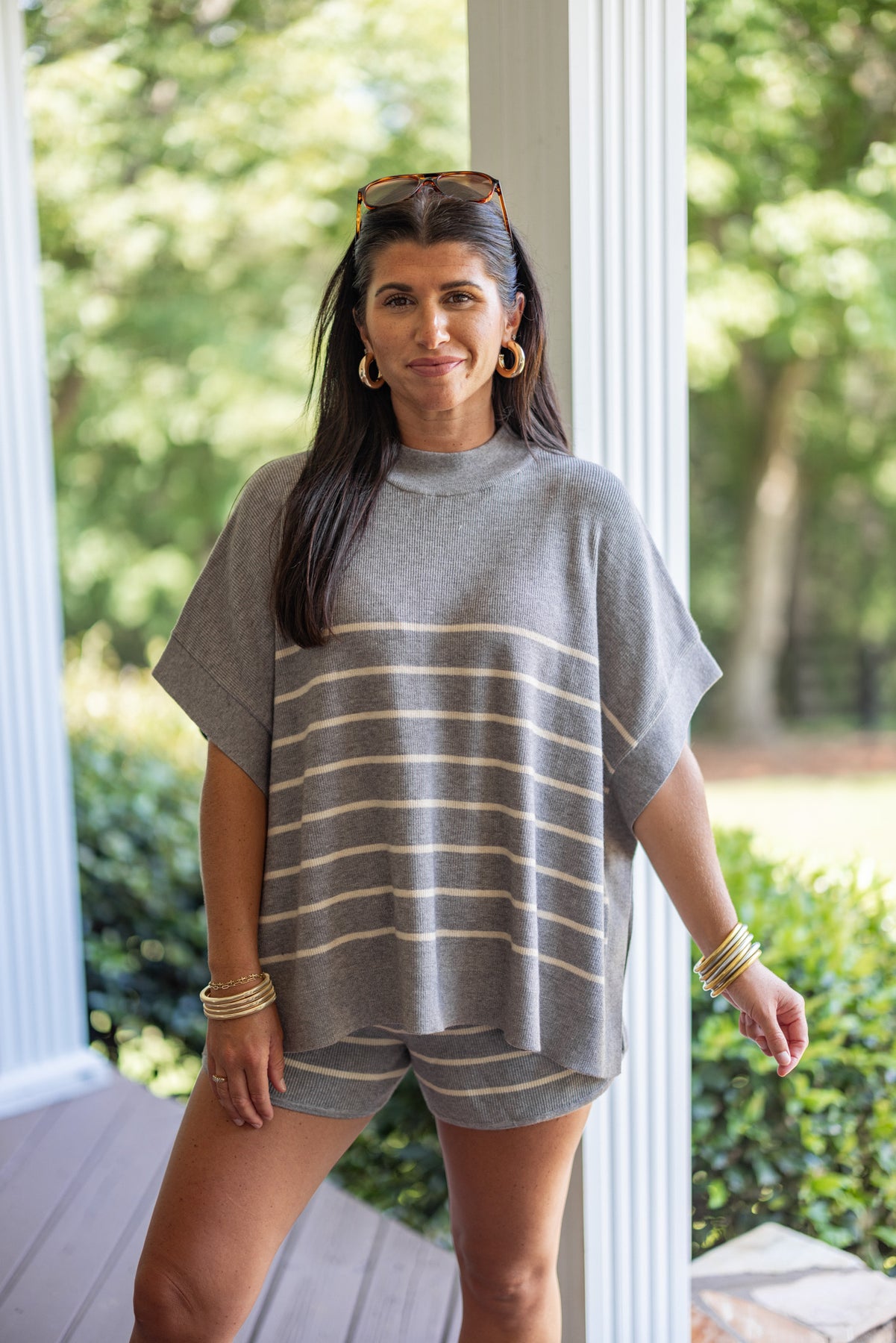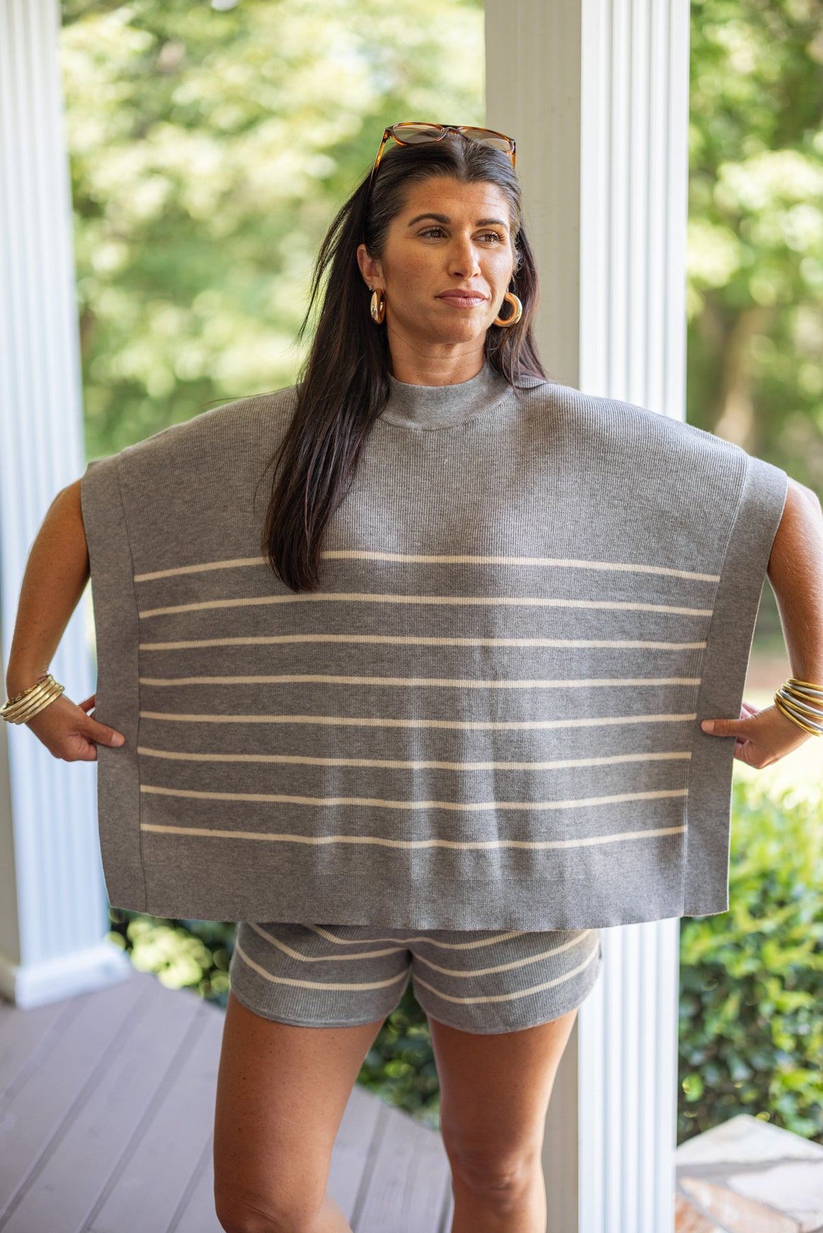 Fall in love with the trendy comfort of our Everyday Chic top! Made with heather grey and beige striped knit fabric, this poncho style babe features a mock neck and short sleeves. Just perfect! Complete the look with our matching shorts for a chic, stylish outfit. Luxuriously soft, high quality fabric!!