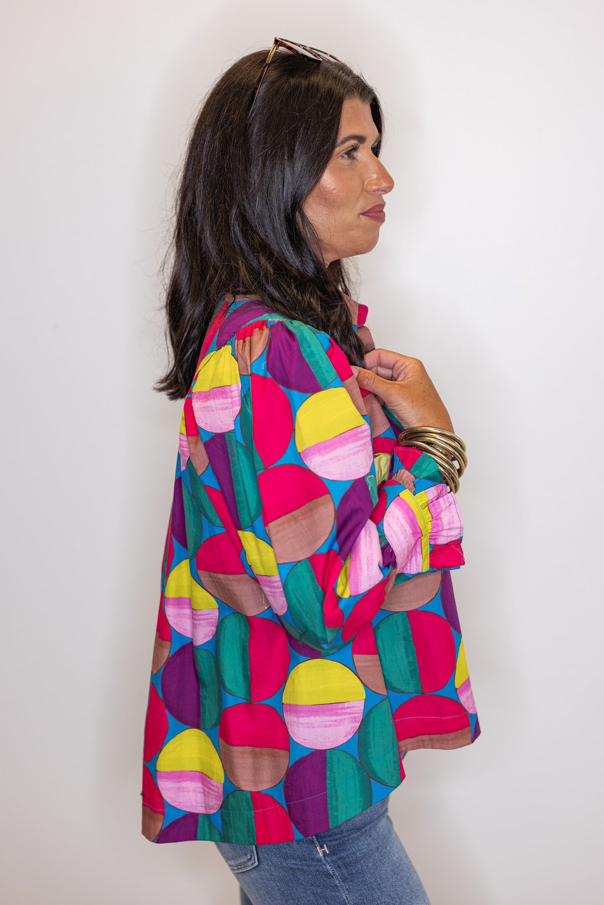 This playful multicolor top pops with pinks, greens, yellows, teal, eggplant, and tan for a super fun outfit! Featuring a button front closure with colorful enamel buttons, a collar, and ruffle cuffed 3/4 length balloon sleeves for a flirty vibe. Perfect for sunny days and casual outings. Shop the matching SKIRT here!