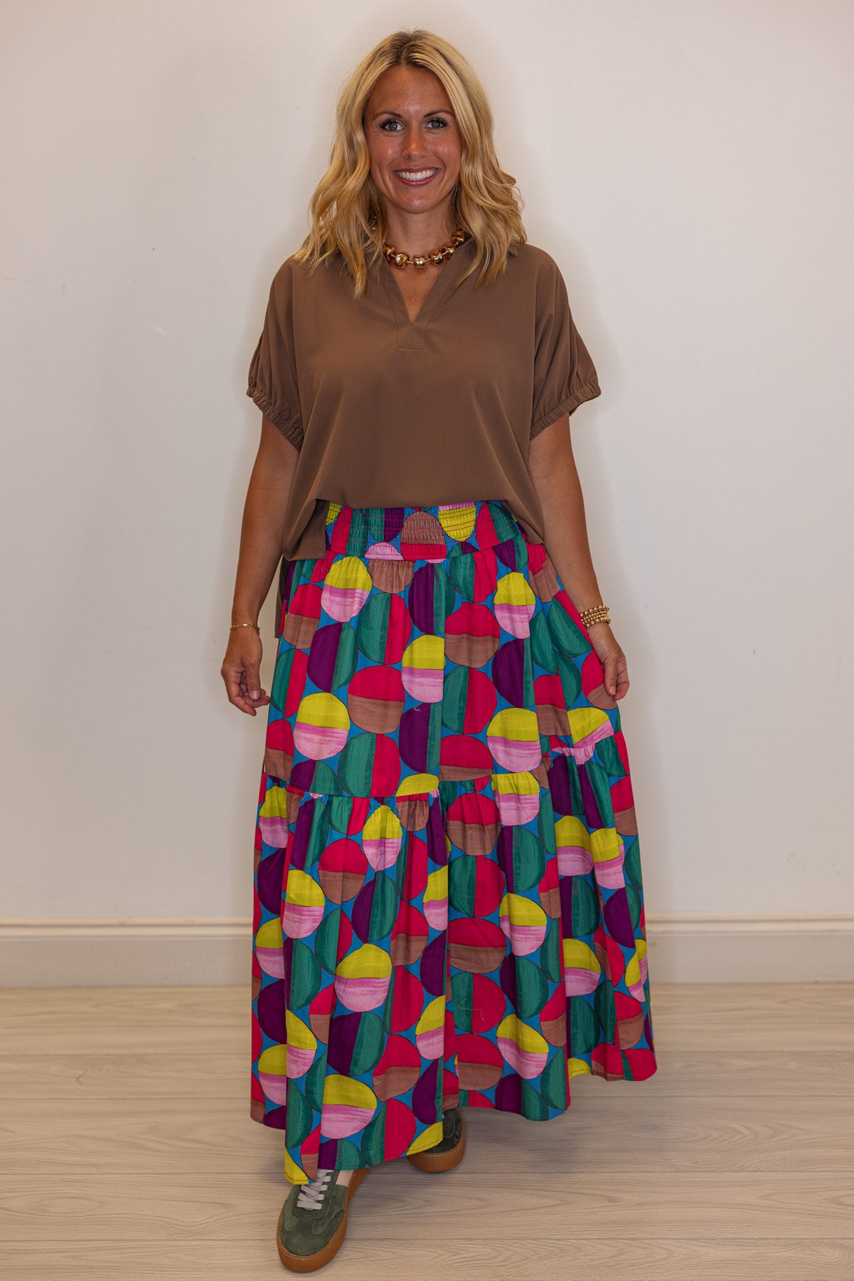 This playful multicolor maxi skirt pops with pinks, greens, yellows, teal, eggplant, and tan for a super fun outfit! Featuring a smocked waist, this tiered maxi is perfect for sunny days and casual outings. Embrace effortless style with this sweet and feminine piece! Shop the look: Matching Printed Top | Solid Brown Top