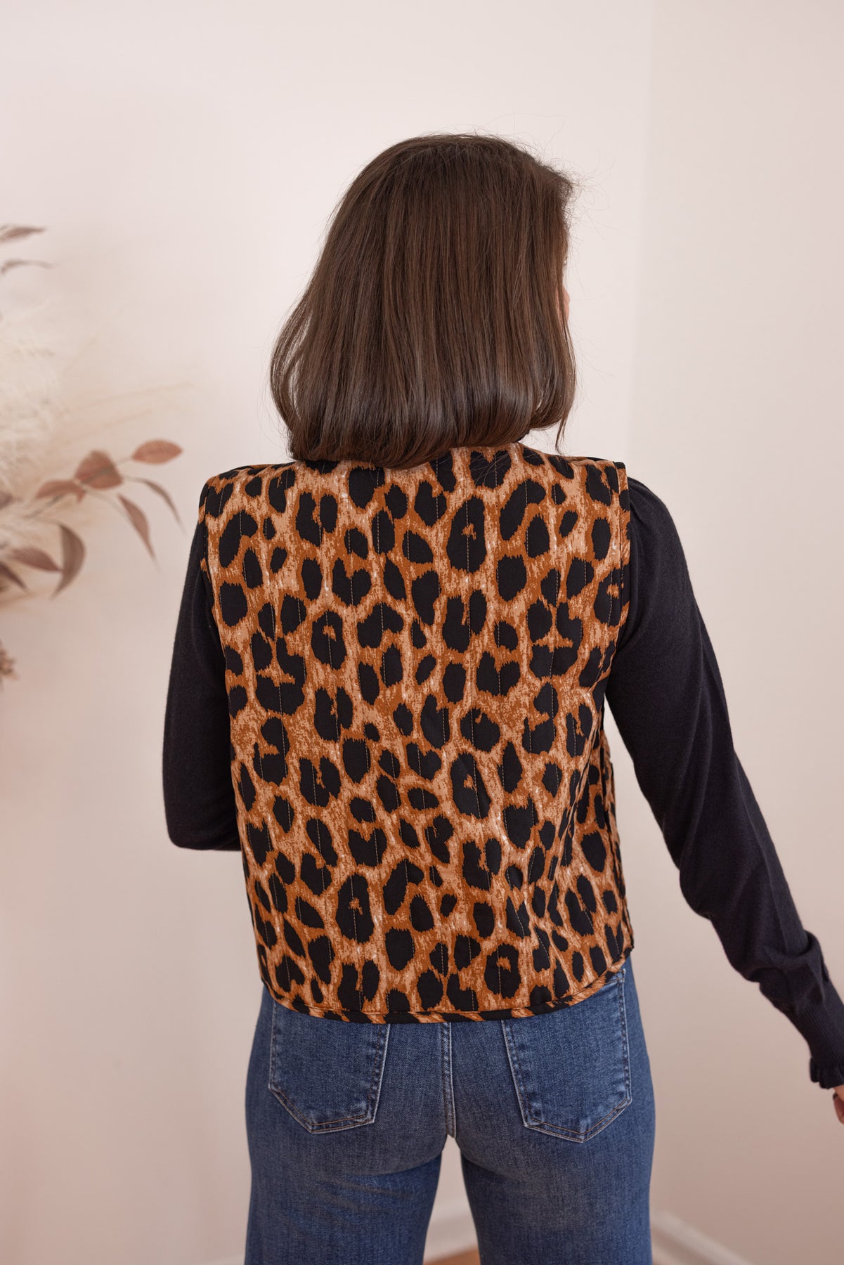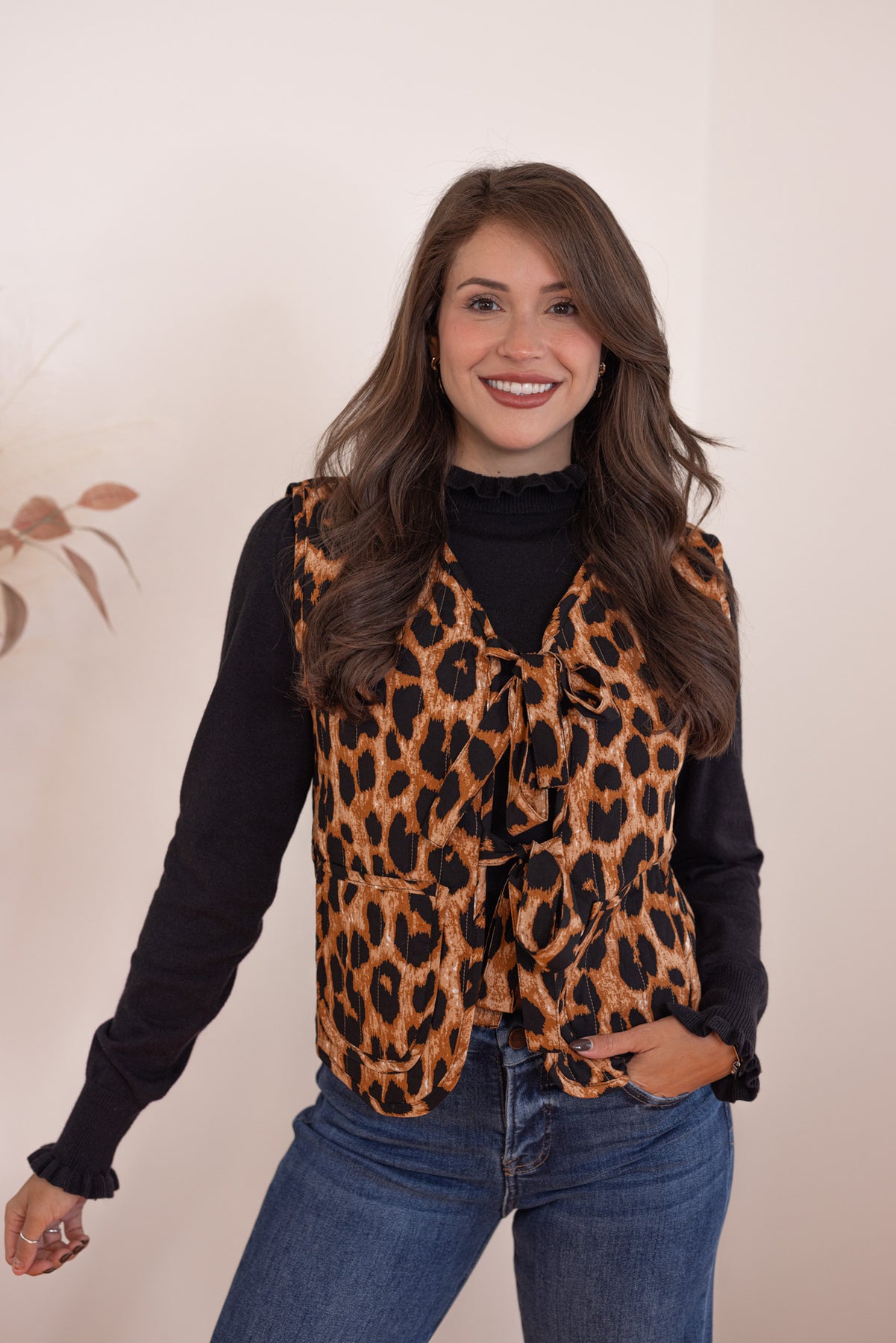Stay stylish and cozy with our Leopard Print Bows quilted vest! Made with leopard print quilted fabric and featuring a unique bow tie front closure, this vest adds a touch of playful charm to any outfit - perfect layered over THIS black lightweight sweater top!