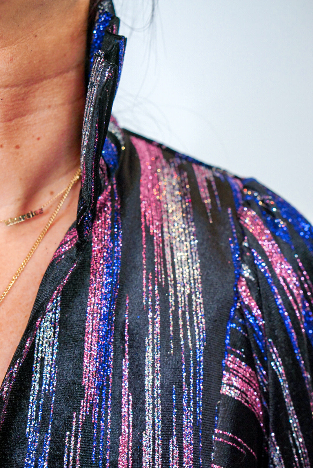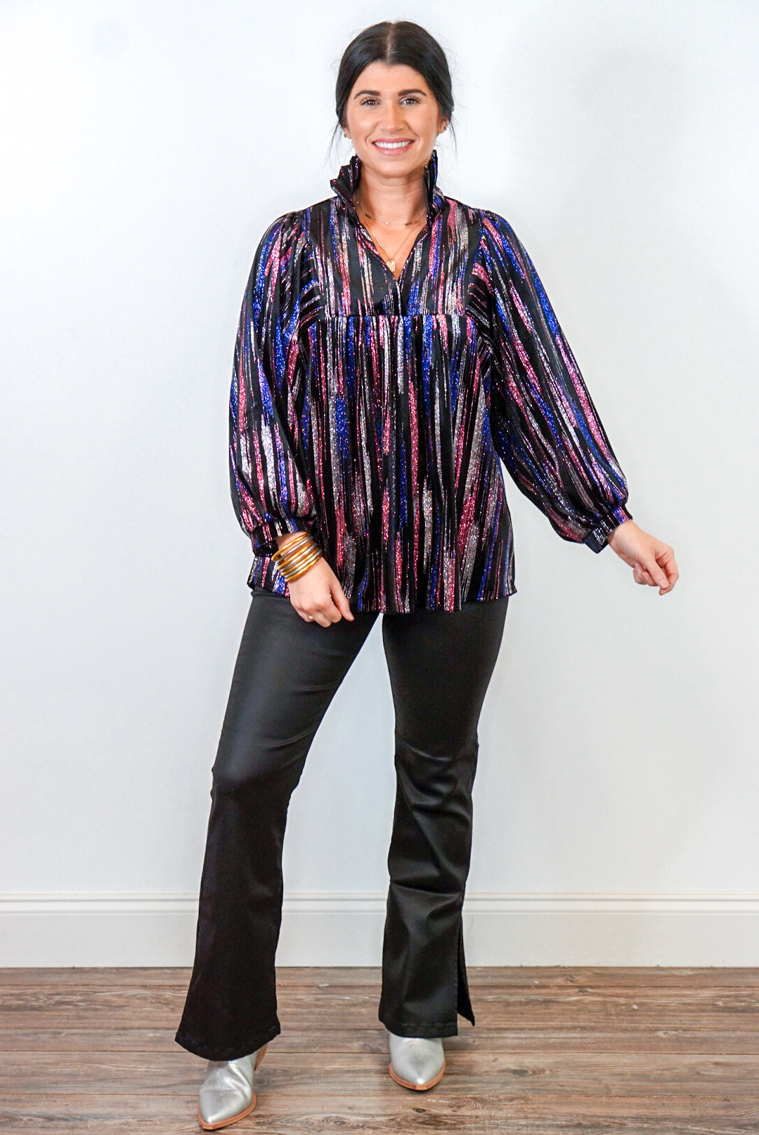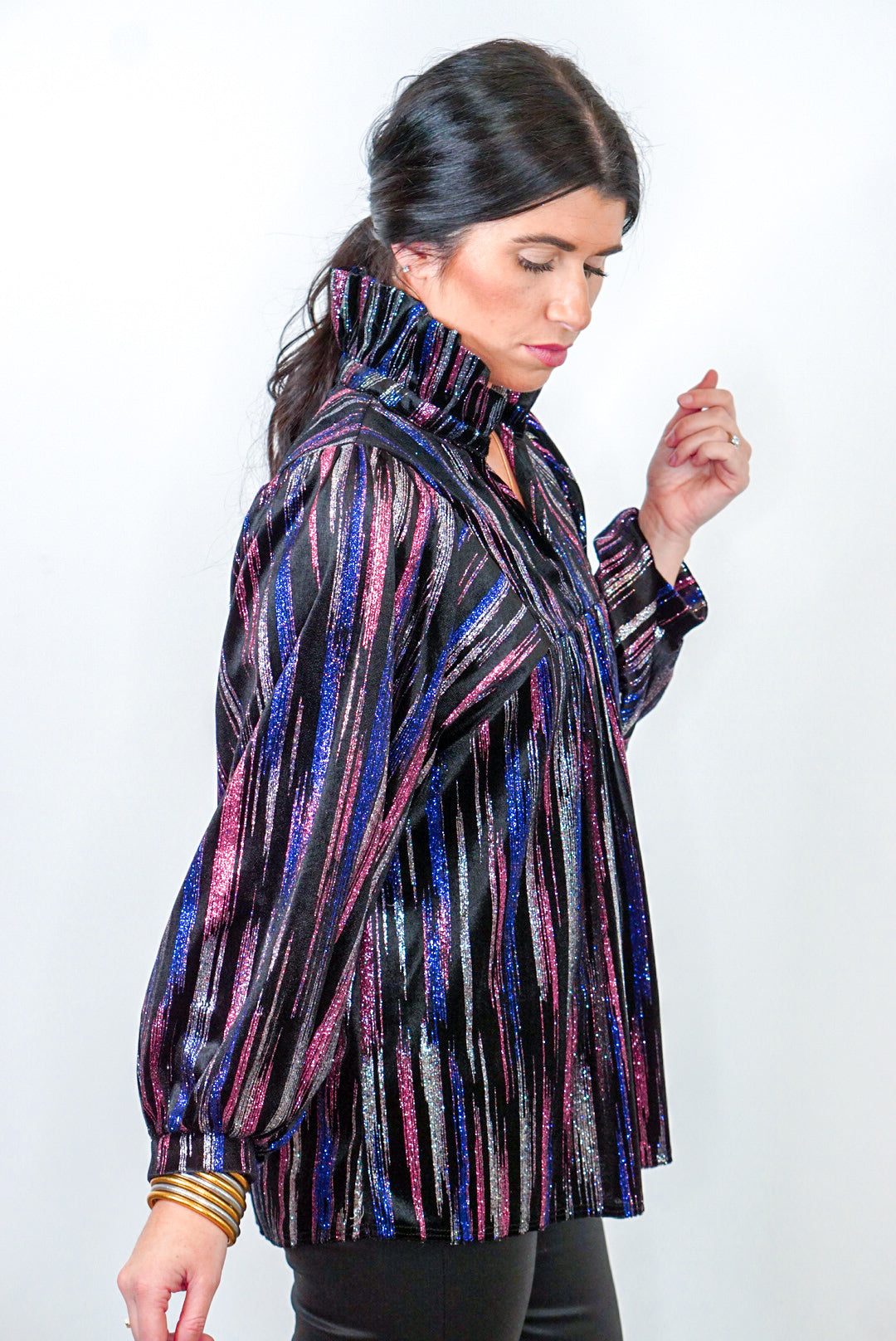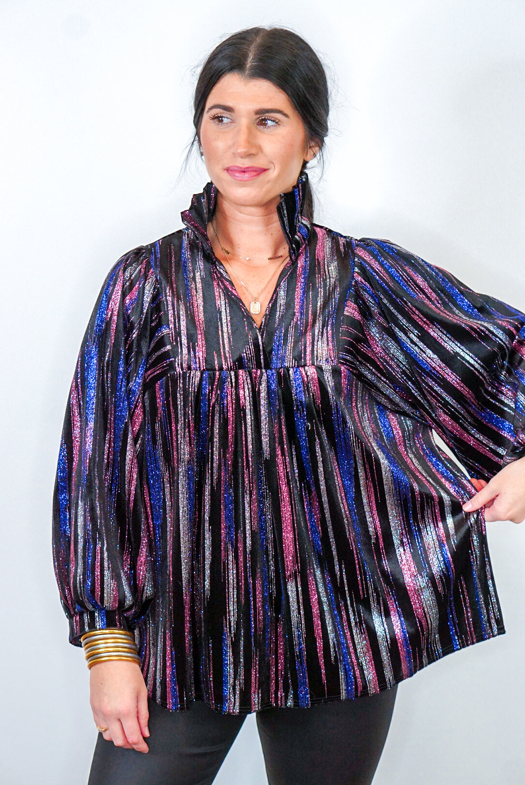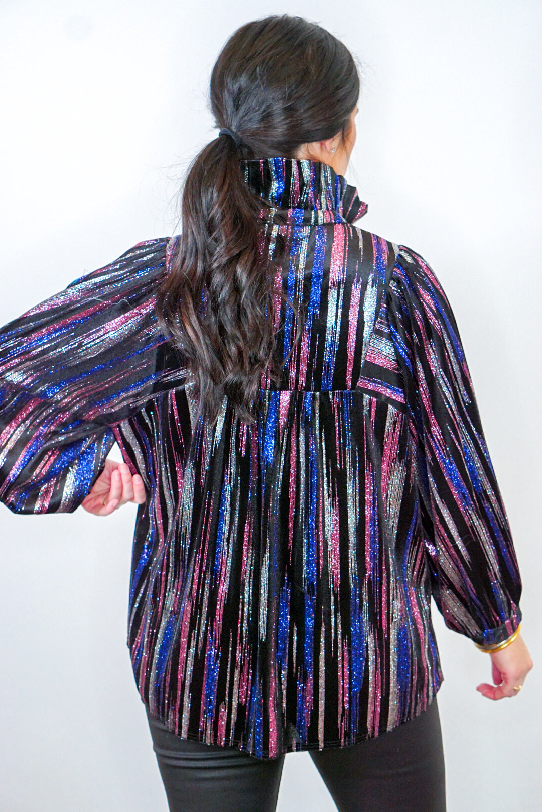 Step into the spotlight with this Glittering Multicolor Black Babydoll Top! Super sassy metallic silver, pink, and blue glitter on black velvet fabric featuring a v neckline with ruffle collar and long balloon sleeves. Dress this cute babe up with heels or boots, then sparkle and shine at your next event - perf for those upcoming New Year's Eve parties!!