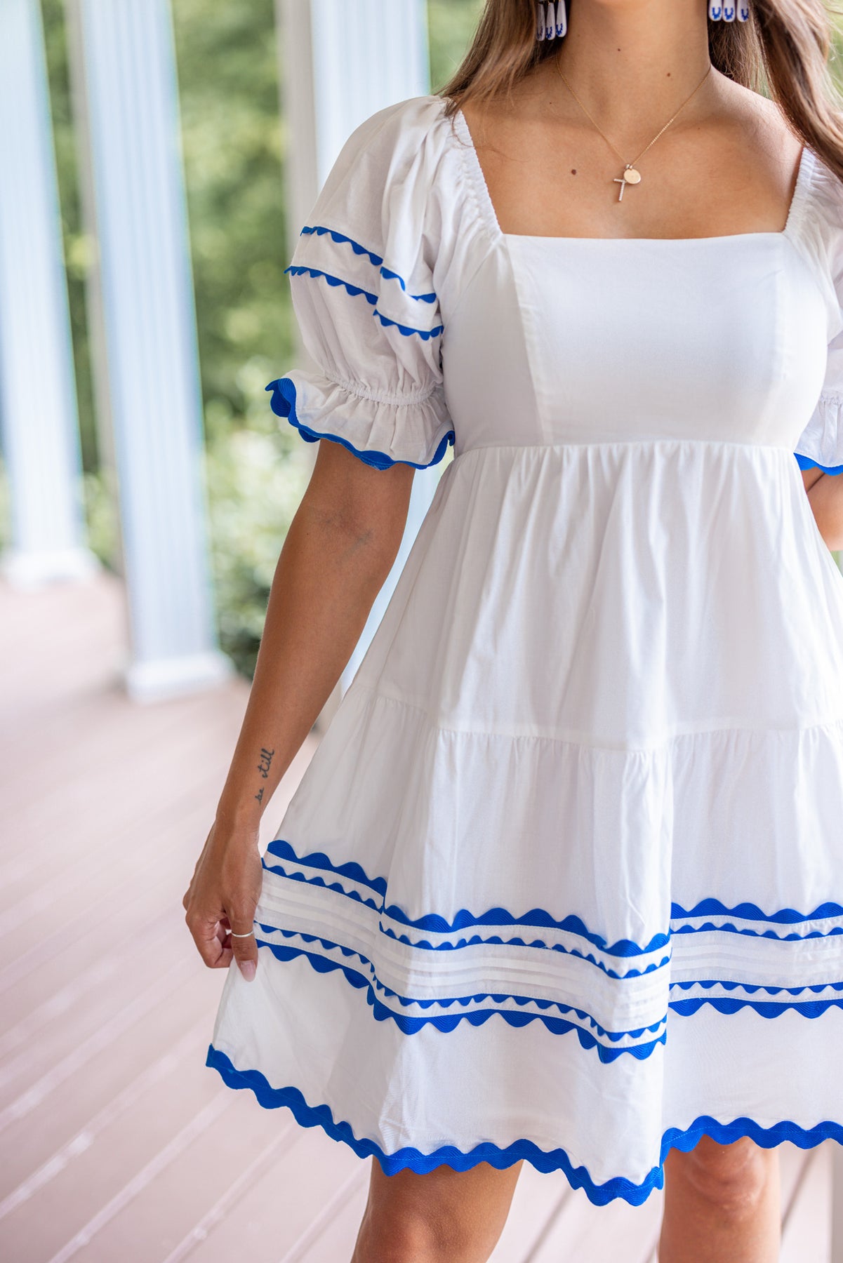 Steal the show this season in our Showstopper Off White Babydoll Dress! Featuring a flattering square neckline, short puff sleeves, tiered skirt, and trimmed with eye-catching blue scalloped piping throughout. This babe is so flirty and playful, you'll feel like the picture of perfection! Dress her up or down for all of those upcoming Summer celebrations, and parties. Shop the look: Shoes