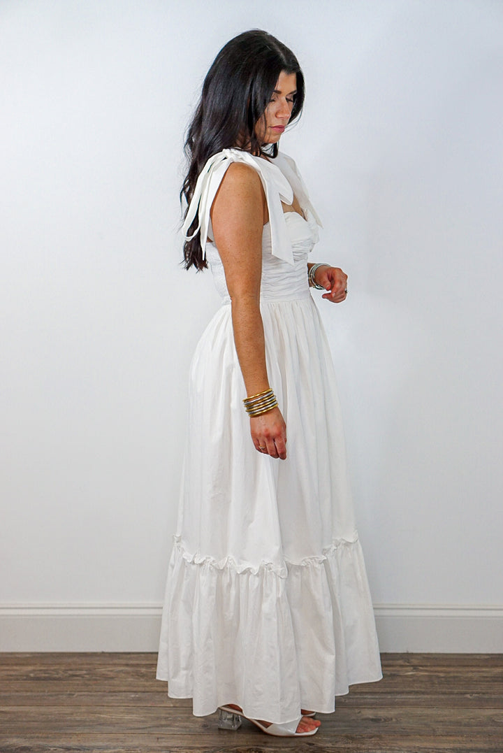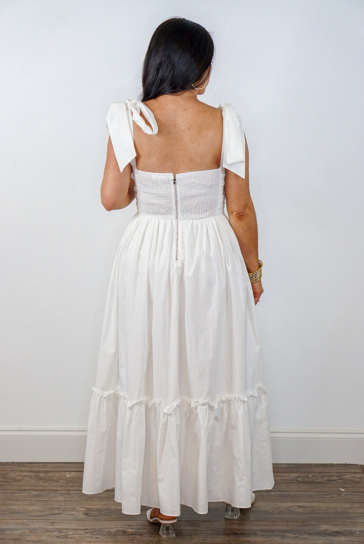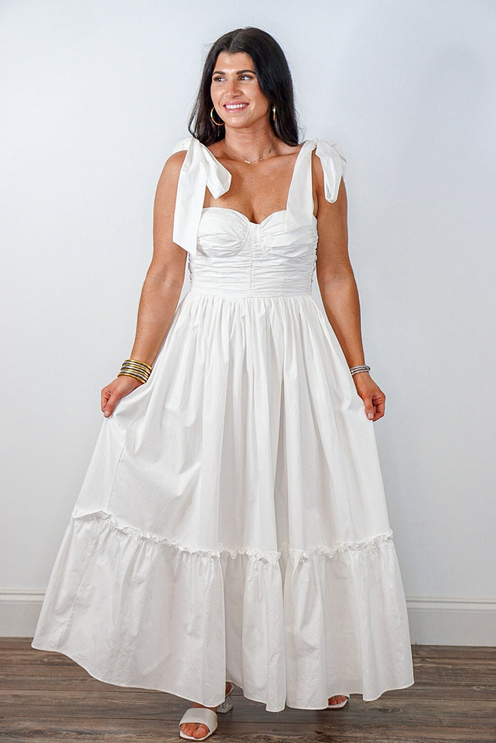 This white dress is pure beauty! Sleeveless midi, featuring a sweetheart neckline with a pleated bodice, self tie shoulder straps, and a full flowy skirt with ruffled bottom hem. So pretty! Perfect for any special occasion, and the ideal dress for our Brides To Be for all of their upcoming bridal showers, luncheons, pictures, etc.