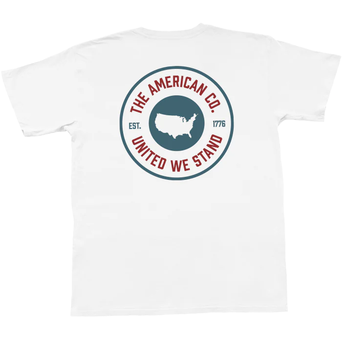 American Co. cotton short sleeve white pocket t-shirt with a classic fit featuring American Co. Patch Design. Also available in youth!