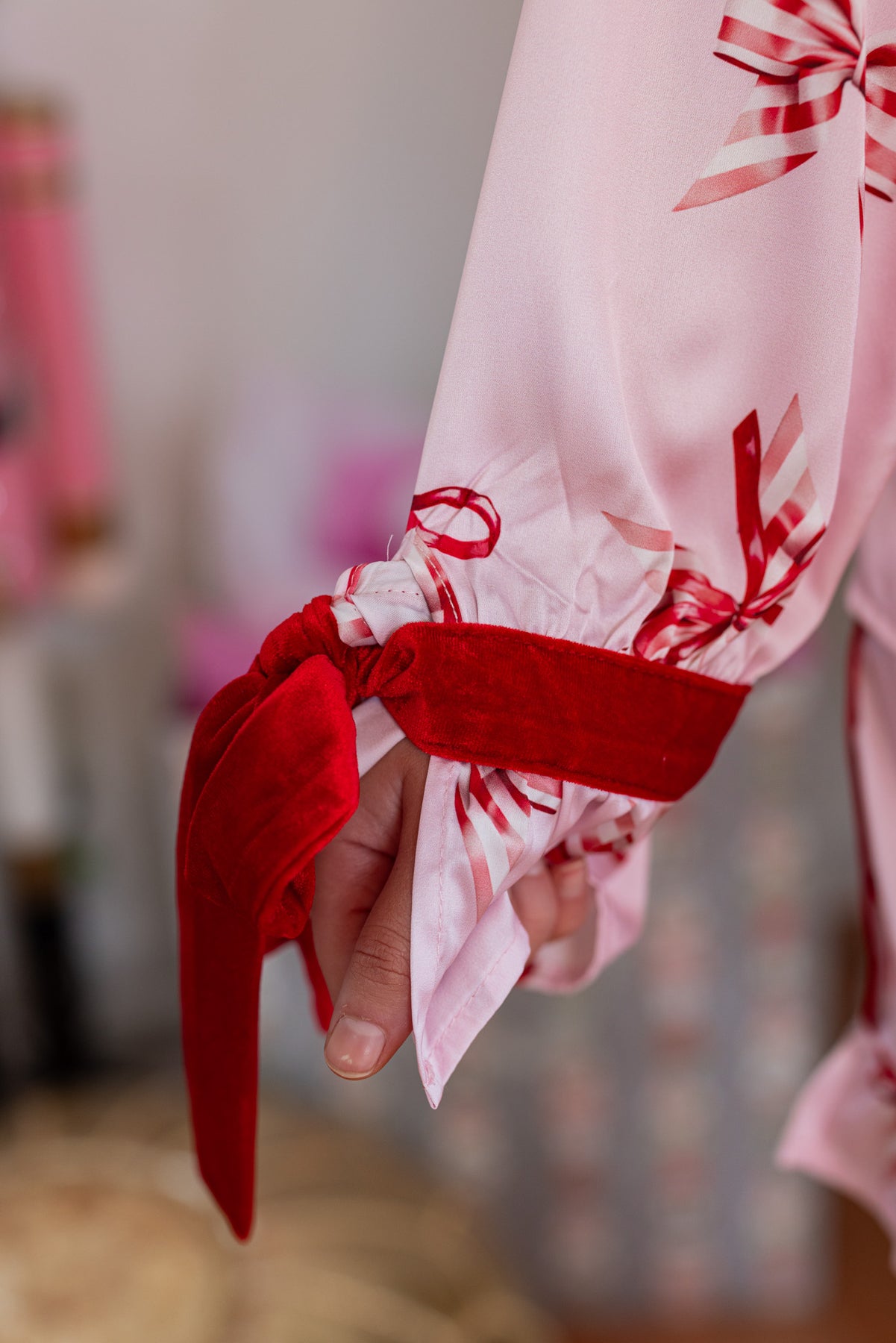 Light pink satin pajama top with red striped bow ties and red velvet bow cuffs