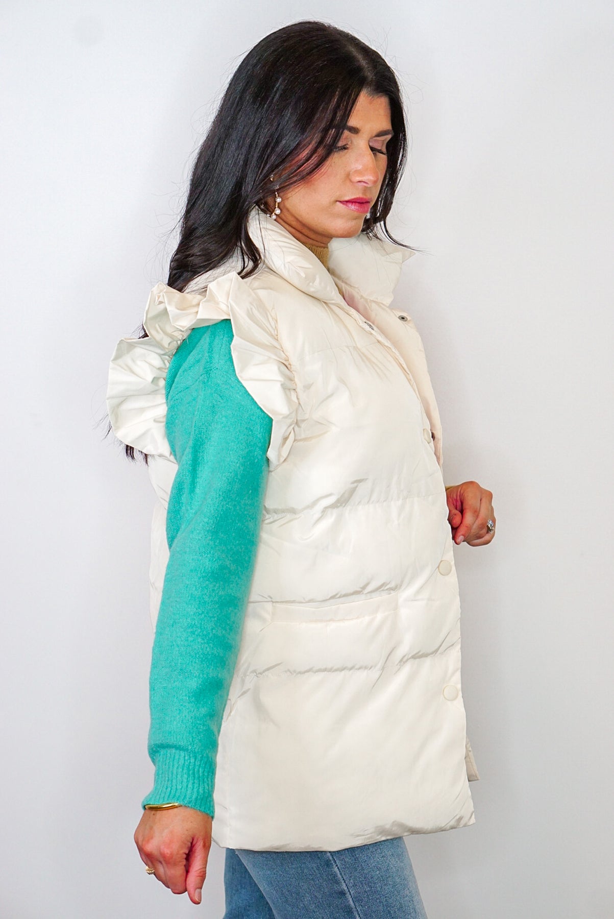 Look and feel fabulous in this cream Ruffled Cutie Puffer Vest! With her puffy silhouette and ruffled shoulders, this down vest makes sure everyone knows you mean business...fashion business, that is. Finishing off the stylish look is a snap front closure. Ready, set, puff! Shop the look: Sweater | Boots