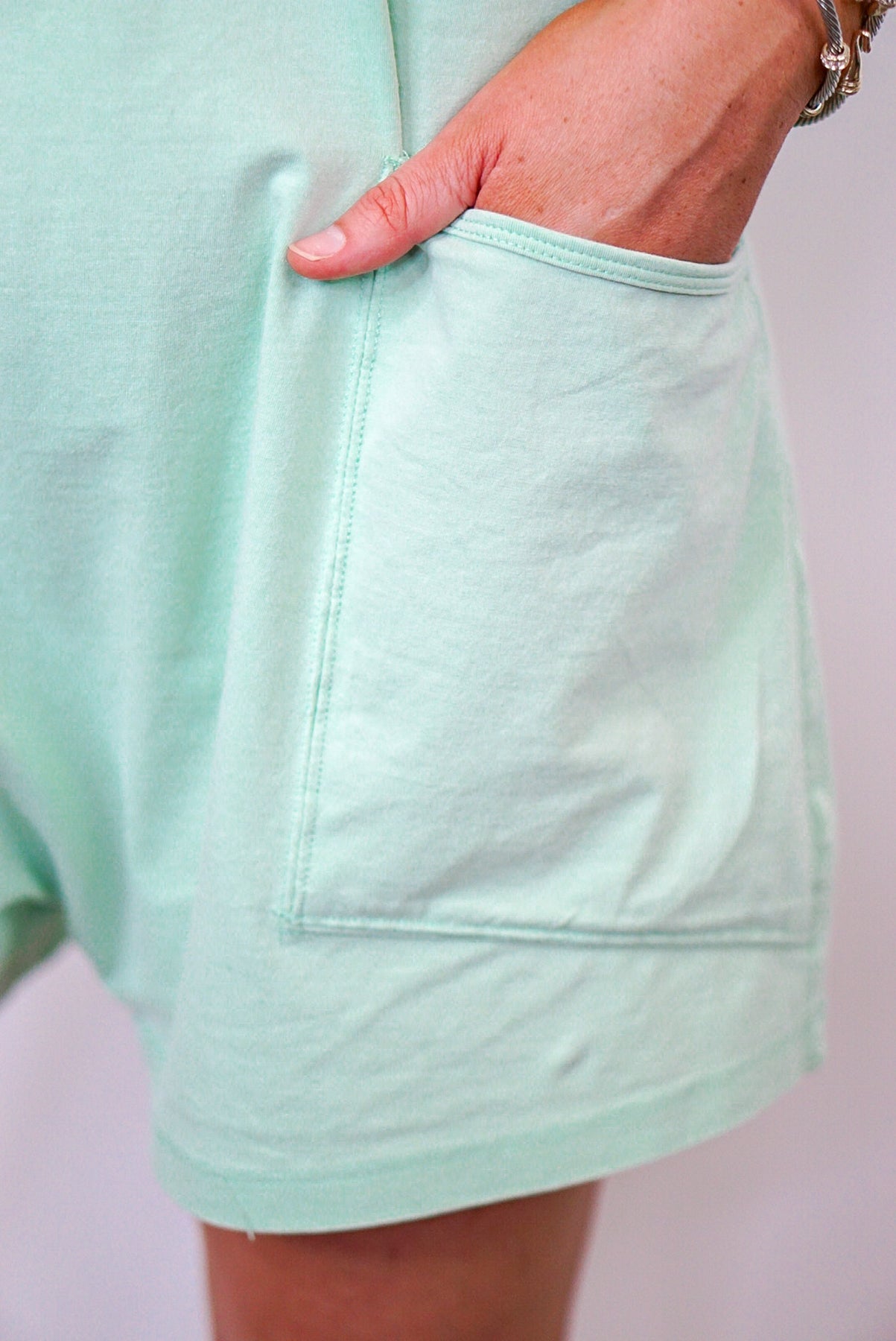 This mint green romper is perfect for running errands, with convenient pockets to hold all your essentials. Stay stylish and comfortable while tackling your to-do list.