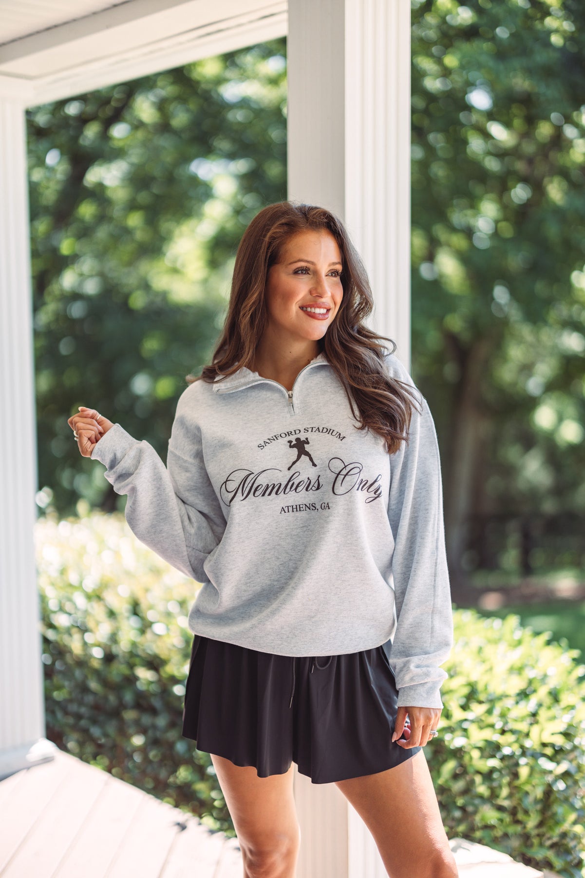 Team pride at its best! Distressed Vintage Couture grey quarter zip sweatshirt, featuring Sanford Stadium Members Only graphics. Perfect for UGA gamedays!! This stylish babe is cute and comfy, making her a must-have for any fashion-forward fan.