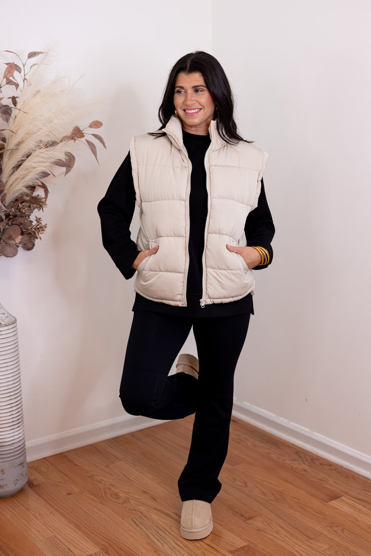 Step into style with our Scuba Knit Perfection black top! This must-have piece features a mock neck and long sleeves with drop shoulder, perfect for any upcoming adventure. Made from luxuriously soft scuba knit, this top will keep you comfortable and looking effortlessly cool! Available in 5 colors HERE! Shop the look: Vest | Spanx Pants | Booties