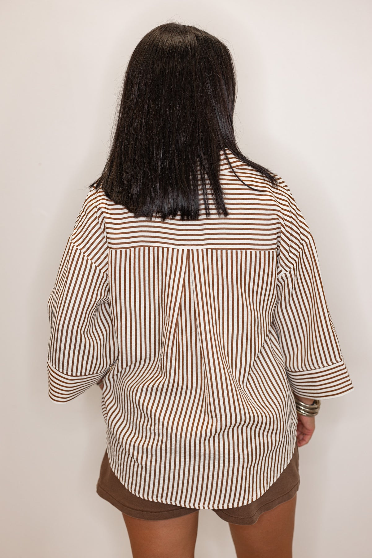 back view of Women's brown and ivory striped 3/4 sleeve blouse