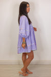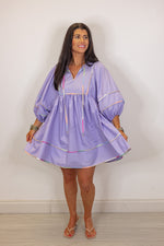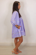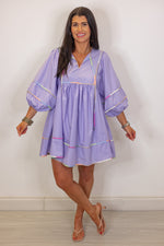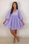Get inspired this spring with our Spring Sunsets Babydoll Dress! Made with a beautiful lavender fabric, featuring a v neckline with self tie detail, and 3/4 length balloon sleeves. She has beautiful multicolor piping trim throughout, for a unique and playful touch. Perfect for adding a pop of color to your wardrobe. Super cute with heels for a special occasion or sneakers for a more casual vibe!