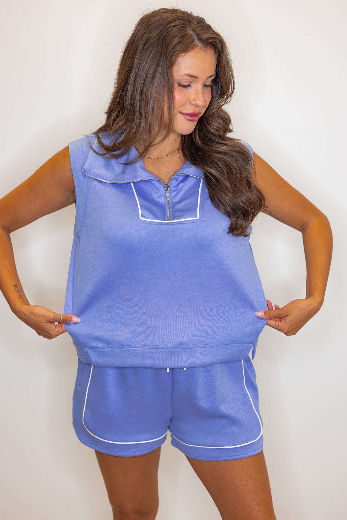 Set your Summer Standards in this adorable luxeknit sleeveless top! Featuring a half zip front closure, and cream piping trim on the bodice. Perfect for adding some trendy comfort to your Summer wardrobe! Shop the matching shorts here for the cutest outfit around!
