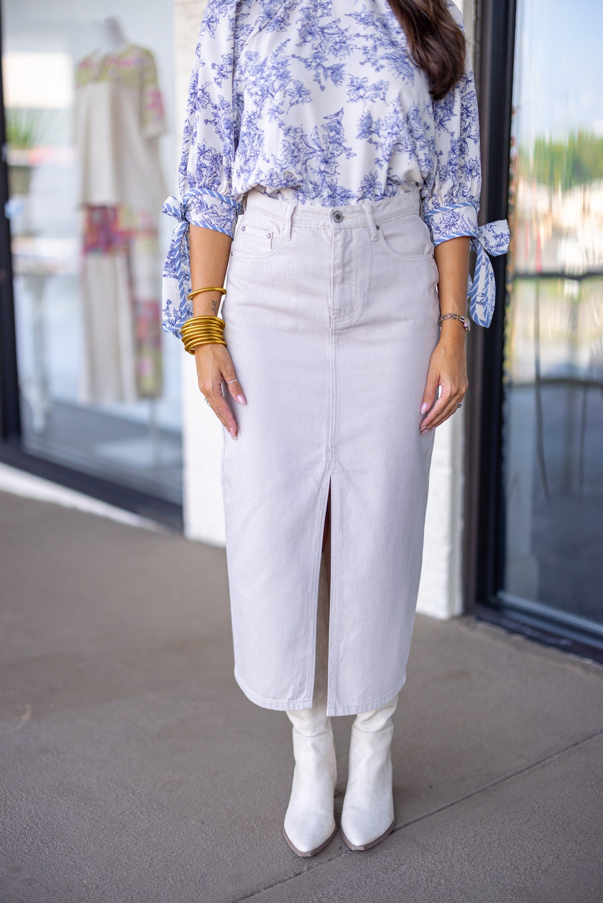 This Timeless Perfection Ecru denim midi skirt is sure to be on your fashion wish list! With a classic style and modern feel in denim, this babe features a traditional button and zipper fly with five pocket design, and a slit in the front bottom hem. Whether wearing boots, sneakers, heels or sandals - let your denim style shine!