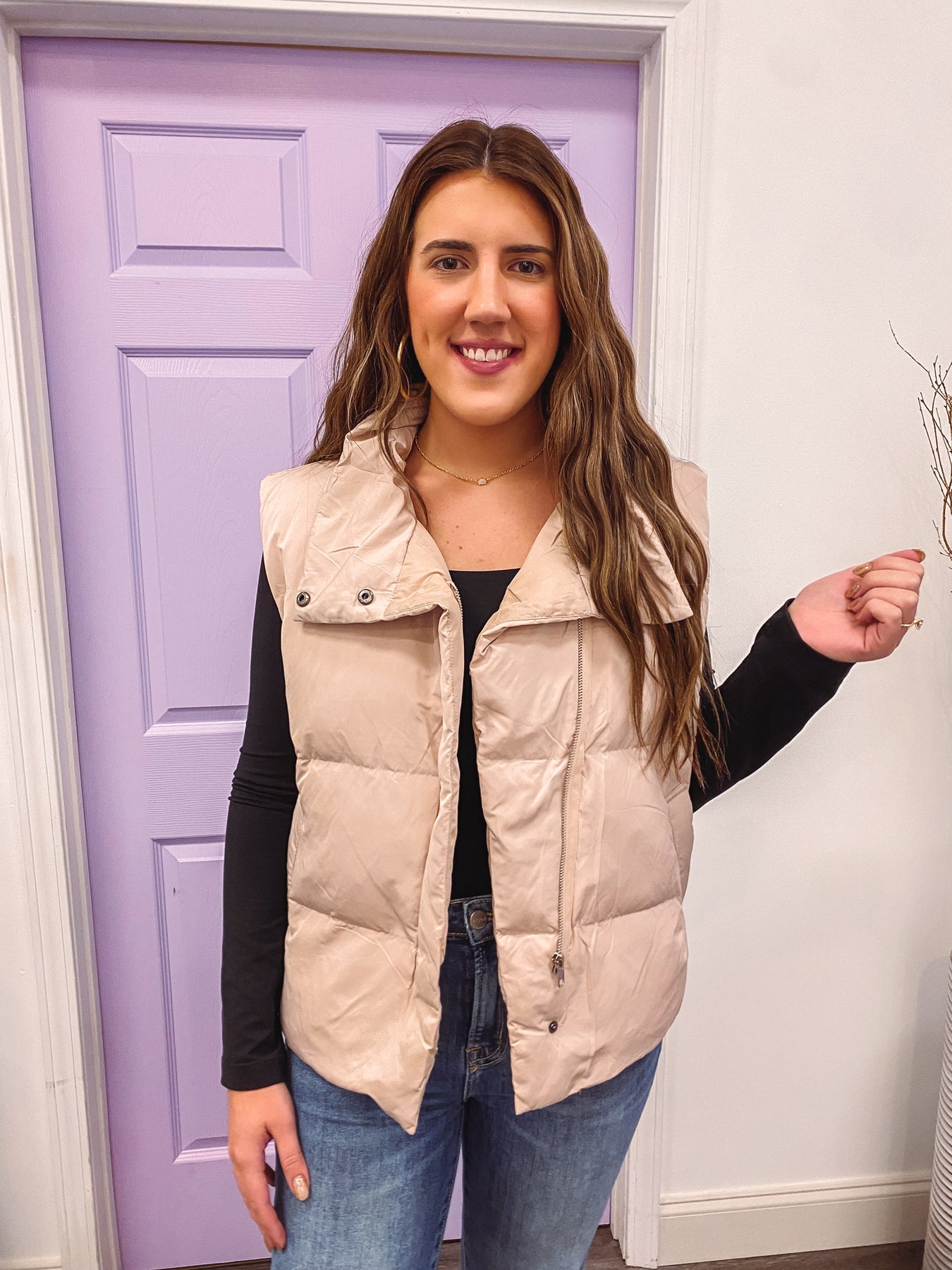 Be the cutest one at your outing in the Beige Quilted Puffer Vest! Stylish and functional, she'll keep you warm without sacrificing your fashion cred. Featuring side pockets and a zip & button front closure, you can take on the chill in effortless style!