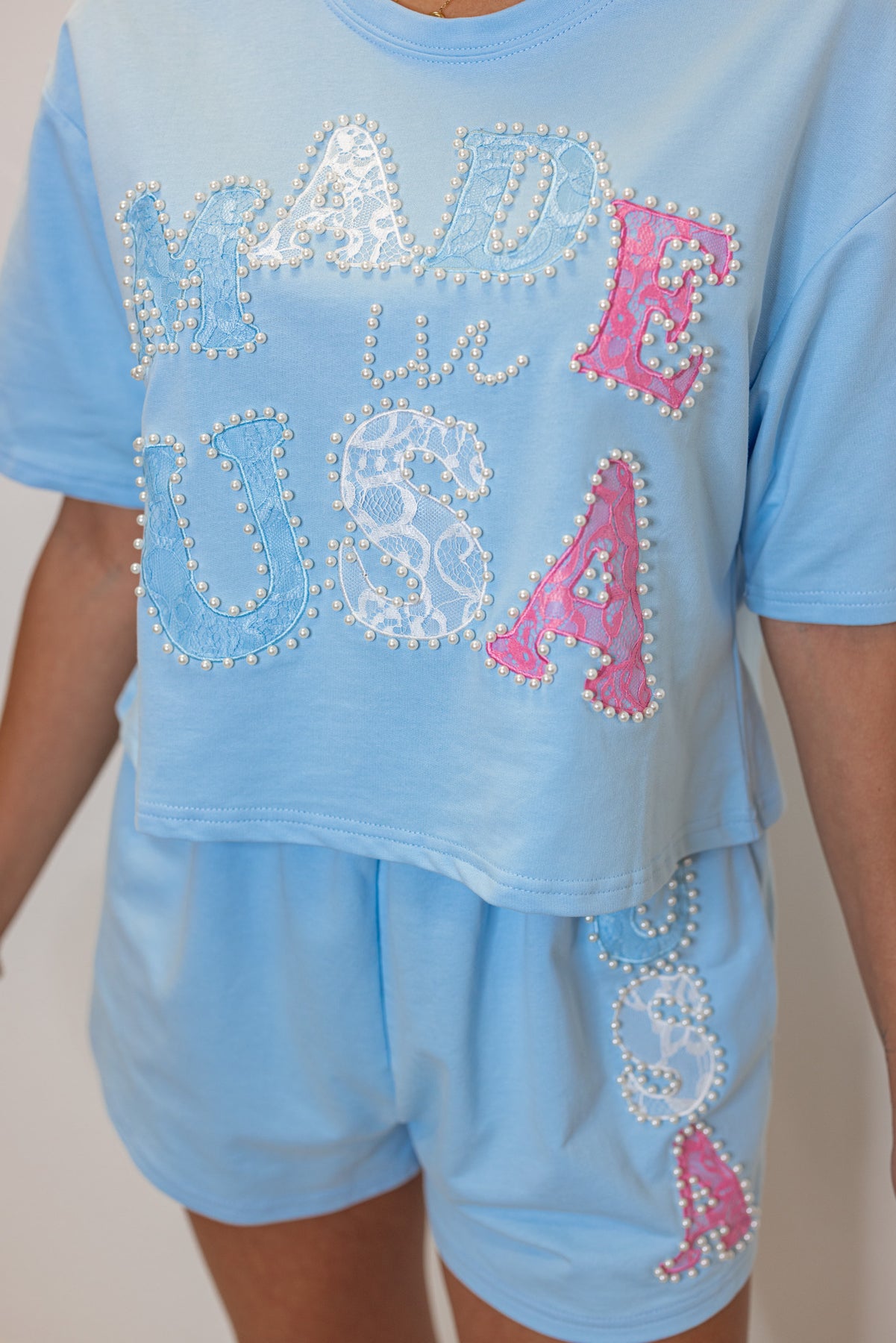 Unleash your patriotic side in elegant style with our USA In Pearls Blue Top! Made from light blue french terry knit fabric, this top features a trendy crew neckline and comfy short sleeves. The real stunner? Pearl trimmed lace letters that say MADE in USA across the front. Prepare for compliments! Pair with the matching shorts for an adorable outfit that's perfect for Memorial Day and July 4th festivities!