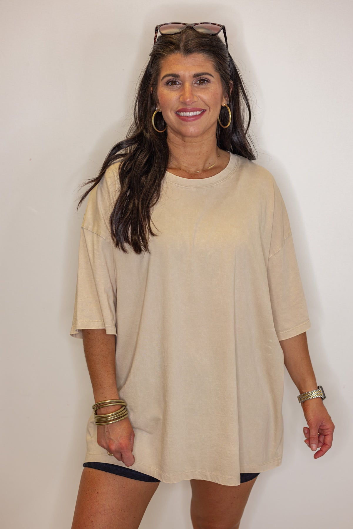 Looking for the perfect oversized tee that's both comfy and stylish? This Washed Mocha Boyfriend Tee has you covered! With a light acid washed finish, round neck, and drop shoulder design, this shirt is both trendy and relaxed. This top is perfect to pair with denim shorts and bikers this summer. Perfect for any casual occasion, you'll be living in this tee.