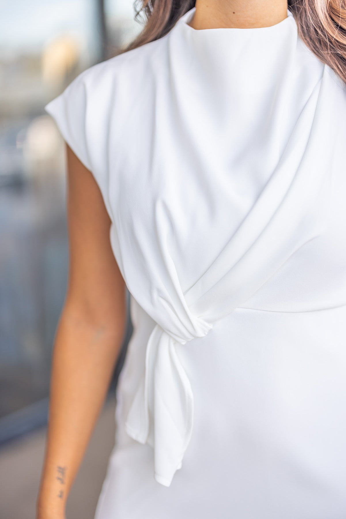 Introducing the Elegance Unveiled White Dress - flaunt your feminine side with the cowl mock neck and elegant wrap style bodice. Perfect for any special occasion, from bridal events, to brunch dates, and everything in between. Guaranteed to make heads turn!