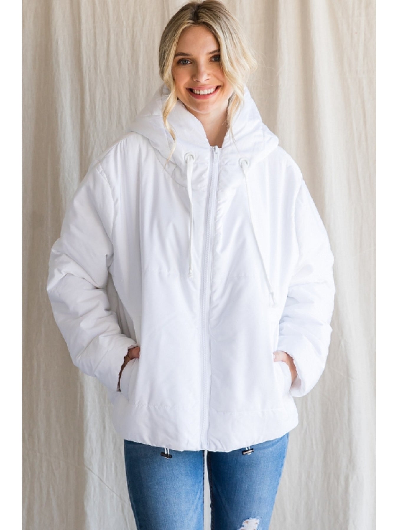We are in LOVE with this babe! White puffy jacket, featuring front zipper closure with drawstring hood, elastic cuffed long sleeves, side pockets, and drawstring bottom hemline with elastic in back. She's absolute perfection! Wear her with your fav boots for a super cute and cozy outfit!