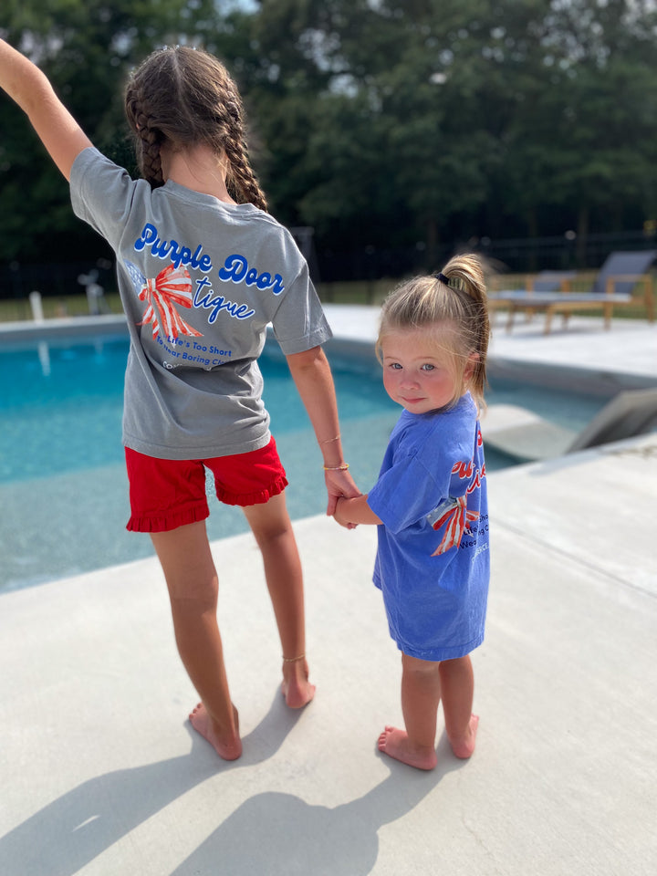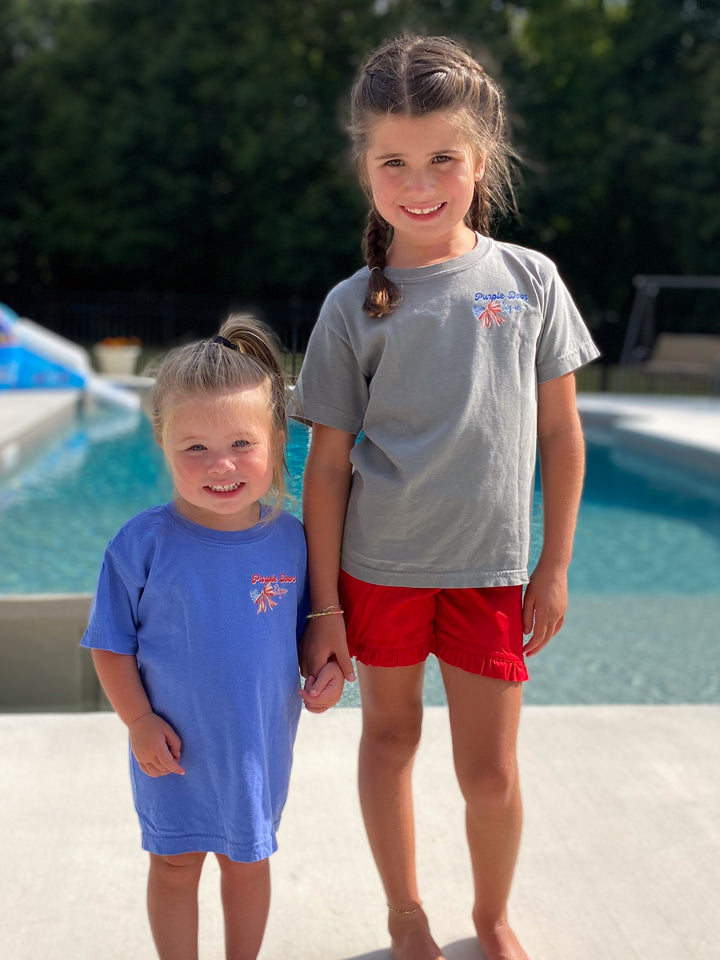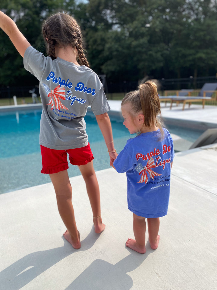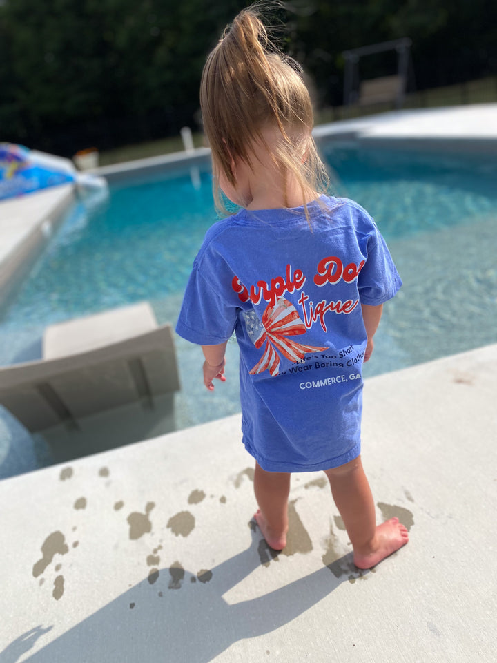 Let your little one show their American Spirit in this adorable Purple Door t-shirt! Featuring our fav Comfort Colors in blue, with an American Flag themed Purple Door Bow-tique logo. So cute! Featuring a crew neckline and short sleeves. Perfect for those upcoming July 4th events. "Life's too short to wear boring clothes" even for kids!